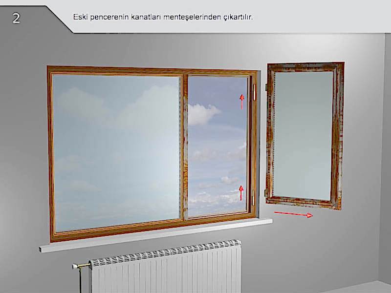 Eski pencerenin kanatları menteşelerinden çıkartılır.