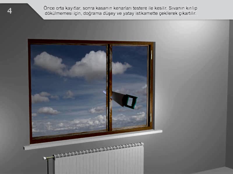 Önce orta kayıtlar, sonra kasanın kenarları testere ile kesilir. Sıvanın kırılıp dökülmemesi için, doğrama düşey ve yatay istikamette çekilerek çıkartılır.