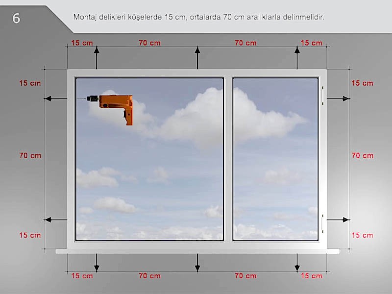 Montaj delikleri köşelerde 15 cm, ortalarda 70 cm aralıklarla delinmelidir.