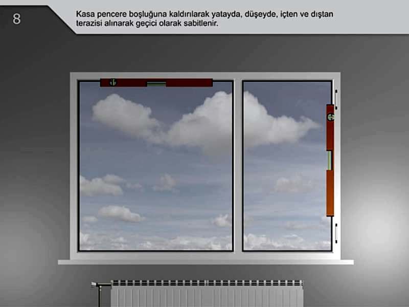 Kasa pencere boşluğuna kaldırılarak yatayda, düşeyde, içten ve dıştan terazisi alınarak geçici olarak sabitlenir.