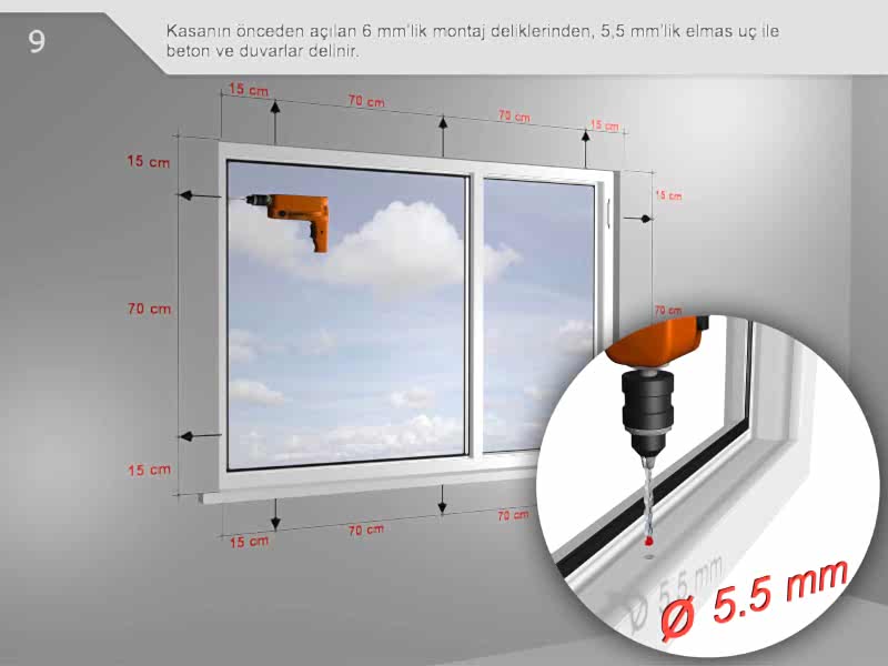 Kasanın önceden açılan 6 mm'lik montaj deliklerinden, 5,5 mm'lik elmas uç ile beton ve duvarlar delinir.