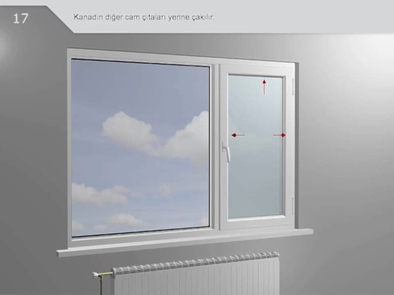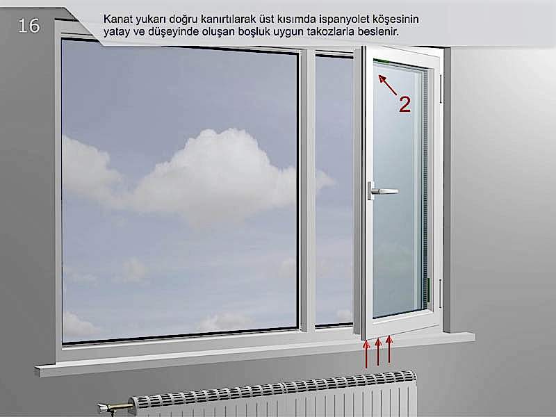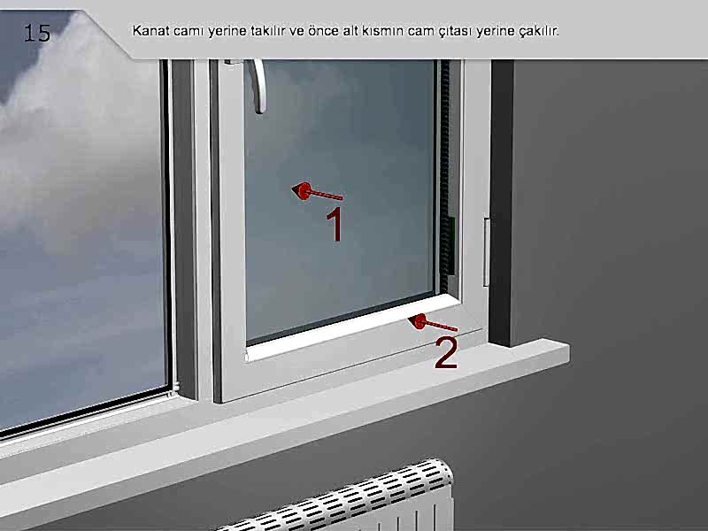 Kanat takılır. Kanat camının takılması için önce alt menteşe köşesinin yatay ve düşeyine kalın cam takozları silikonla yapıştırılır.