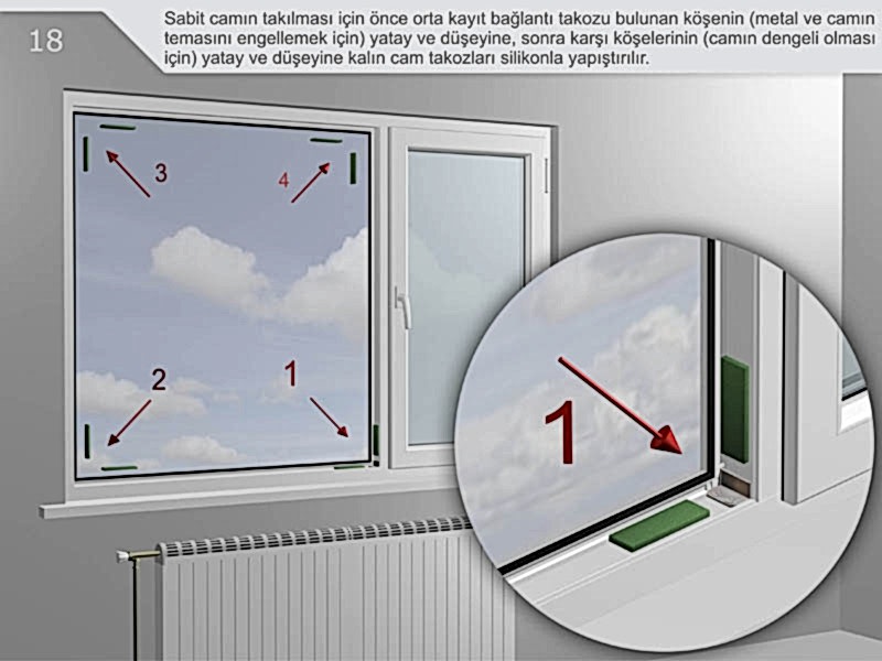 Sabit camın takılması için önce orta kayıt bağlantı takozu bulunan köşenin (metal ve camın teması engellemek için) yatay ve düşeyine, sonra karşı köşelerinin (camın dengeli olması için) yatay ve düşeyine kalın cam takozları silikonla yapıştırılır.